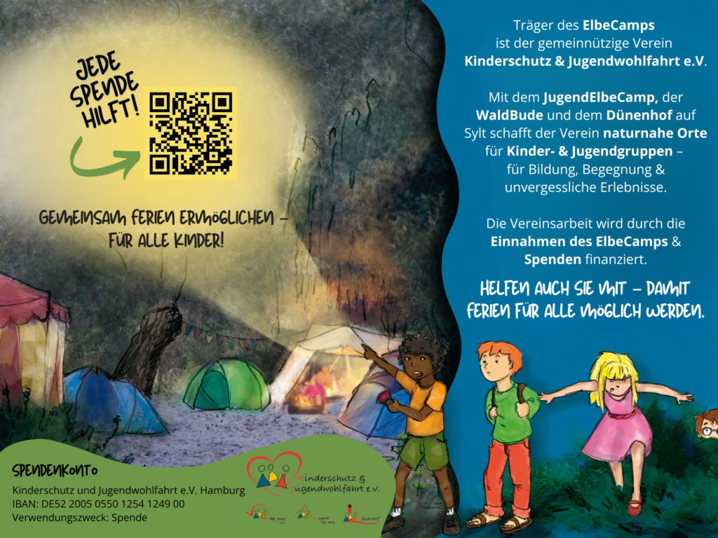 Alle überschüssigen Einnahmen des ElbeCamps fließen direkt in die Vereinsprojekte zugungsten von Kindern und Jugendlichen ein. Um diese Angebote weiterhin unterstützen zu können, sind wir zusätzlich auch auf Spenden und Unterstützungen angewiesen.